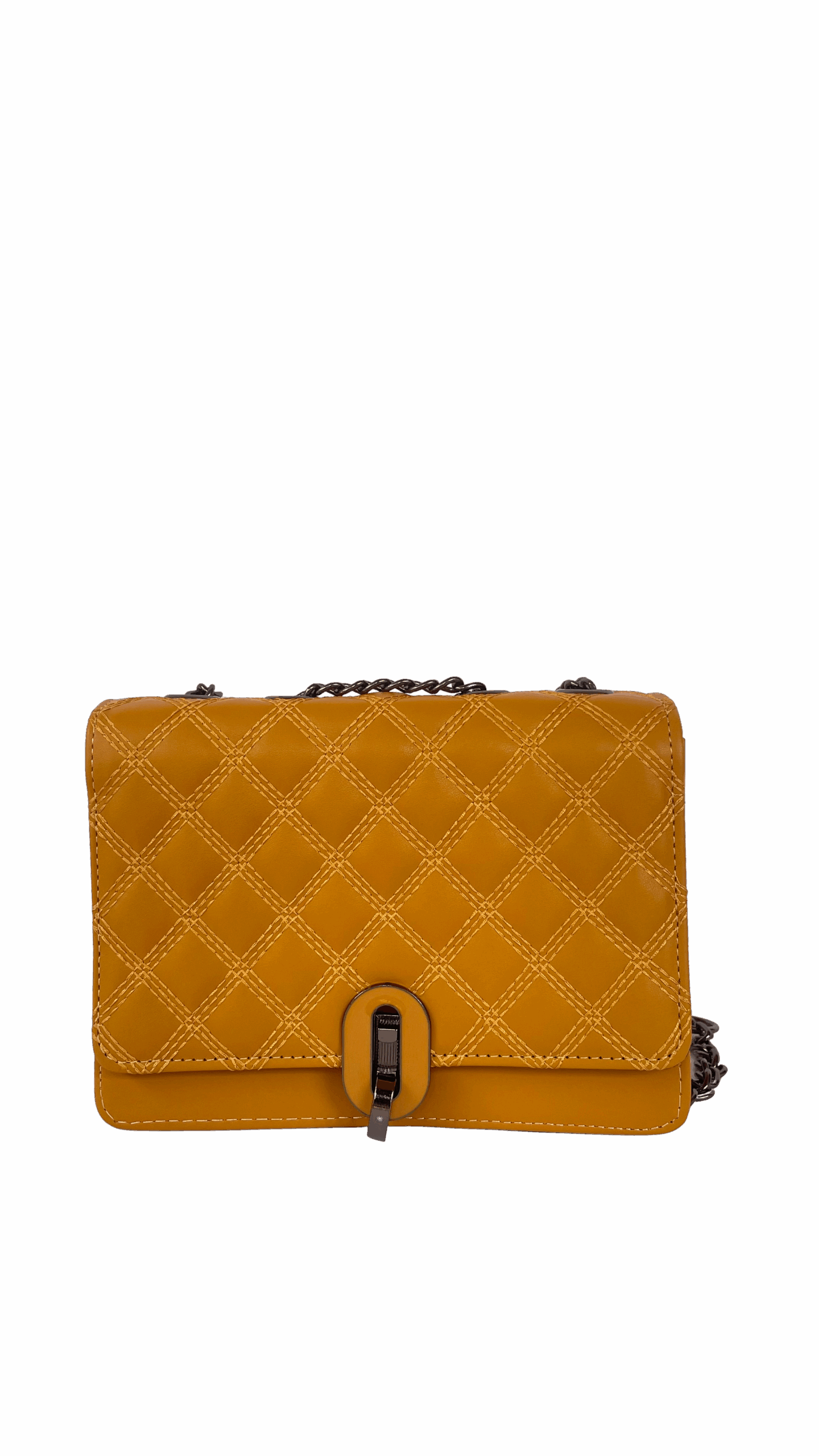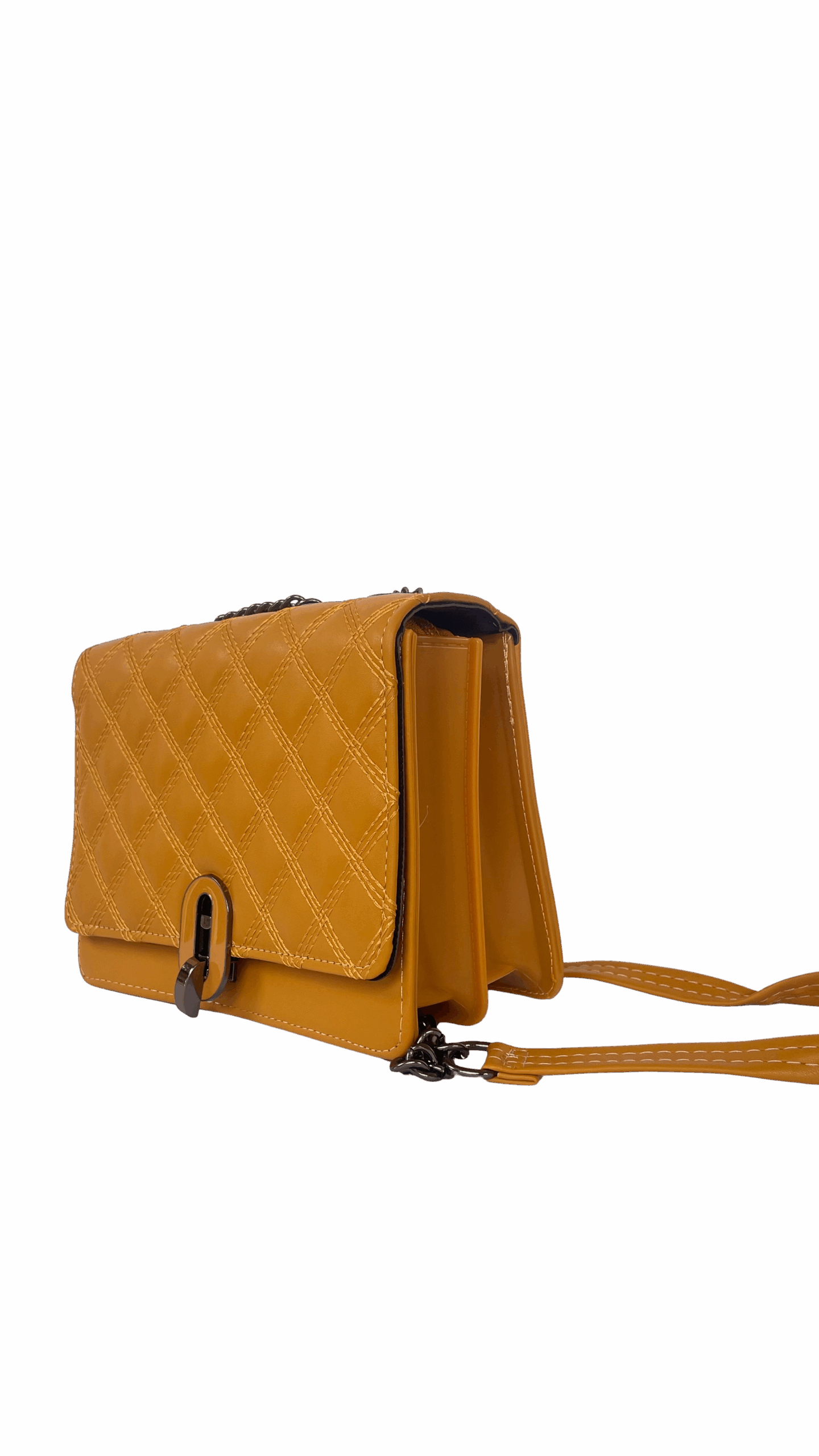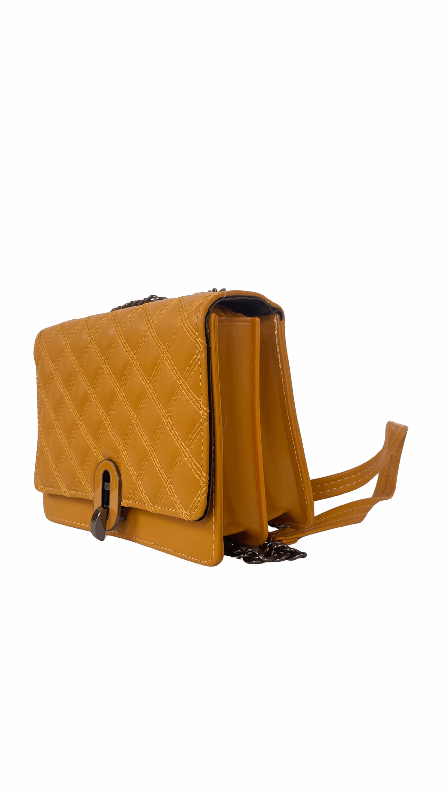 The Classic Quilted Chain Bag in Mustard Yellow is your go-to accessory for adding a pop of color and sophistication to any outfit. Crafted with a sleek diamond-quilted design and accented by a modern buckle closure, this bag combines elegance with everyday practicality. Its structured silhouette holds your essentials neatly, while the leather-and-chain strap offers versatile styling for shoulder or crossbody wear. Bold yet refined, this bag is the perfect blend of fashion and function—whether you’re heading to brunch, a night out, or simply elevating your daily look.
